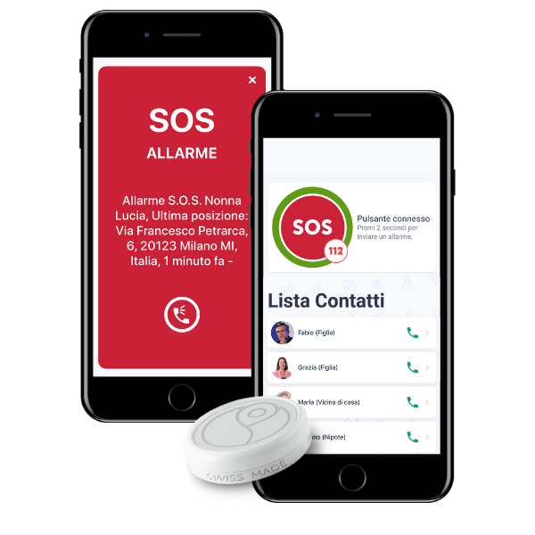 - Pulsante salvavita che l’anziano porta sempre al collo e che si attiva automaticamente in caso di caduta e può essere attivato manualmente per segnalare l’emergenza